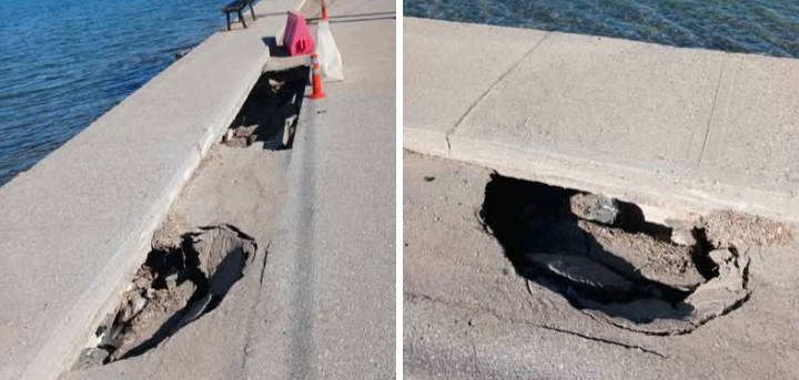 Σύμφωνα με πληροφορίες, το μεγαλύτερο πρόβλημα δεν είναι αυτό που φαίνεται στις φωτογραφίες τις οποίες και επισυνάπτουμε αλλά το ότι έχει κουφώσει αρκετά μεγαλύτερο κομμάτι λόγο του χειμέριου κύματος καθιστώντας το σημείο το οποίο χρειάζεται άμεση αποκατάσταση επικίνδυνο!!!