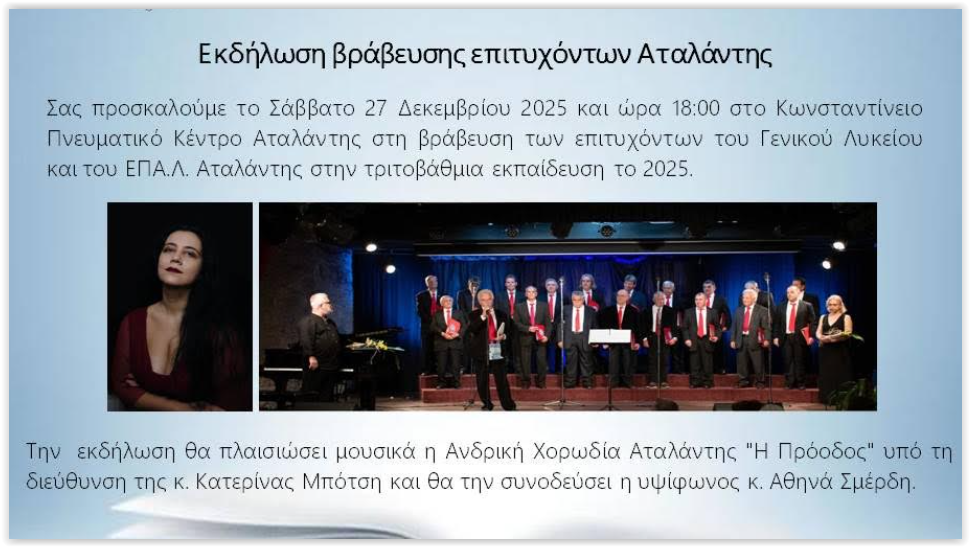 Εκδήλωση βράβευσης επιτυχόντων 2024-2025 Αταλάντης και συναυλία της Αντρικής Χορωδίας Αταλάντης "Η Πρόοδος"