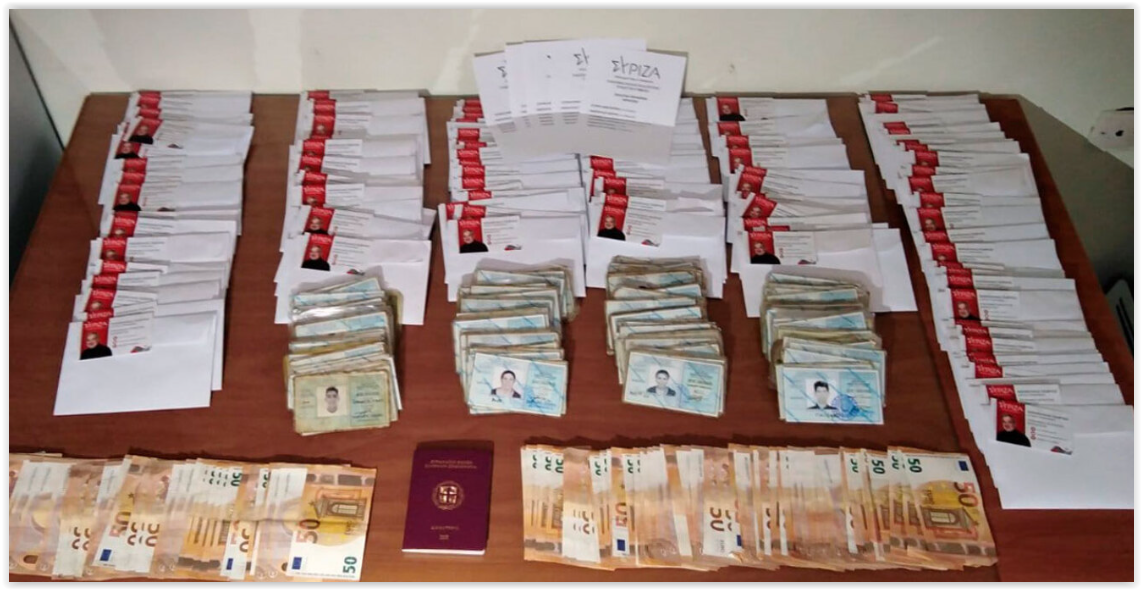 Ειδικότερα, κατά τη διάρκεια ελέγχου, εντός οχήματος ιδιοκτησίας ενός εκ των συλληφθέντων, βρέθηκαν 197 Δελτία Ταυτότητας, Διαβατήριο, 2 φωτοαντίγραφα Δελτίων Ταυτότητας καθώς και μία σακούλα με 114 κλειστούς φακέλους που έκαστος περιείχε κάρτα υποψήφιου Βουλευτή και 5 ψηφοδέλτια με «σταυρωμένο» το όνομα του συγκεκριμένου υποψήφιου.