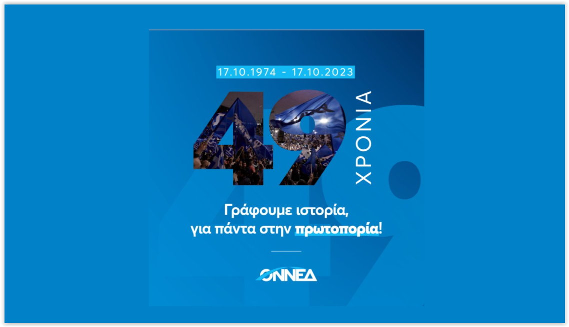 «Σήμερα, γιορτάζουμε την 49η επέτειο από την ίδρυση της ΟΝΝΕΔ. Της Οργάνωσης που από το 1974 έως σήμερα, έχει διαγράψει μια εντυπωσιακή πορεία, με βασική πυξίδα την προσφορά στην πατρίδα και τον άνθρωπο.