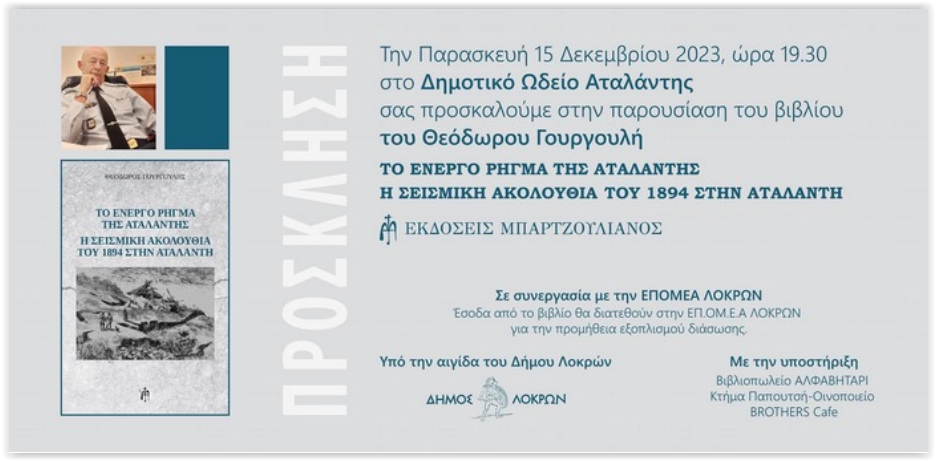 Παρουσίαση του βιβλίου του Θεόδωρου Γουργουλή “ΤΟ ΕΝΕΡΓΟ ΡΗΓΜΑ ΤΗΣ ΑΤΑΛΑΝΤΗΣ – Η ΣΕΙΣΜΙΚΗ ΑΚΟΛΟΥΘΙΑ ΤΟΥ 1894 ΣΤΗΝ ΑΤΑΛΑΝΤΗ” την Παρασκευή 15/12/23